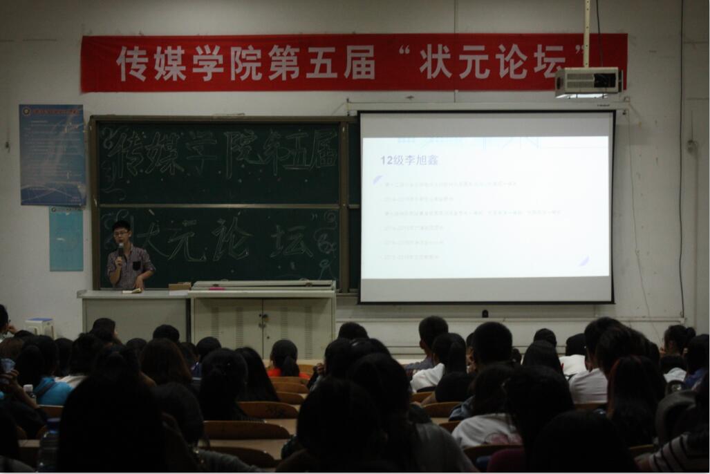 9月23日晚,我院于320教室举办第五届“状元论坛”第二期。本次活动邀请了2013级播音与主持艺术专业李旭鑫、2014级广告学专业赵少飞、2014级视觉传达设计专业续振楠。