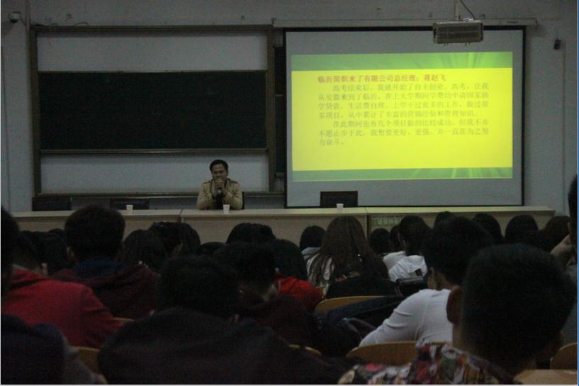 蒋赵飞首先与同学们分享了他自主创业的经历,并讲述了他上学做过的一些项目,以及在创业过程中积累的丰富的营销经验和管理知识。他详细讲述了大学时期卖军训服、考试辅导资料、平安夜卖平安果以及新生入学卖校车卡的经历,鼓励同学们要养成勤奋努力,培养吃苦耐劳的精神。接着,薛传奇阐述了“创业对大学生的概念”这一问题。他鼓励想创业的学生积极组建创业团队,参与团队中,不仅增强利益,也能懂得团队组建、团队运营。安金与同学们分享了他毕业后从做销售到组建创业团队的过程,并叮嘱了创业的注意事项以及创业合伙人的选择问题。同时,他鼓励同学们想做就去做,要大胆的尝试,不要拖沓,勇敢追梦随后,韩露讲述了做微商的经验。她表示不要害怕尝试,要摆正自己的心态。同时,她向同学们剖析了微商鱼龙混杂的情况,向大家传达了“先做人后做事”的经商态度;