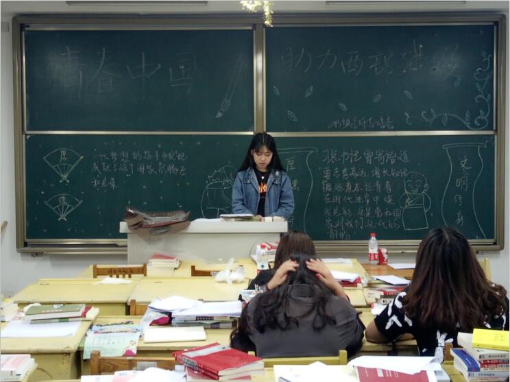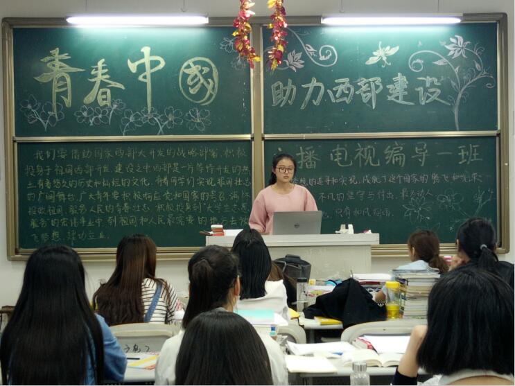 团支书引用习近平总书记的寄语——要志存高远,增长知识,锻炼意志,让青春在时代进步中焕发光彩,这是党和国家对我们这一代的期盼,号召同学们奉献青春,助力西部。