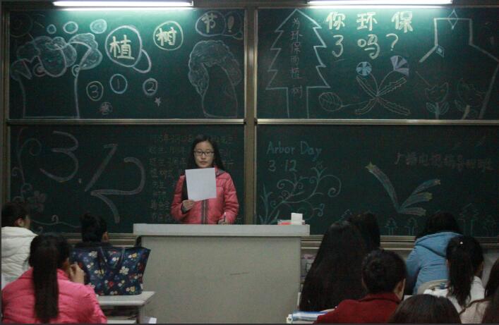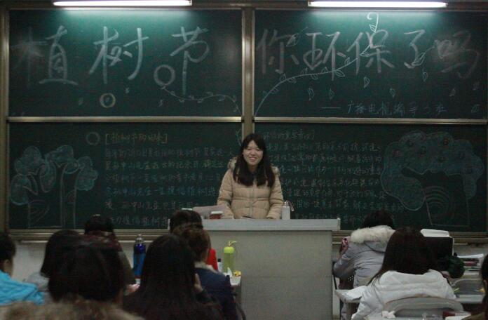 本次团课以班级为单位,由各班团支书组织。团课前,各班对黑板进行了主题布置,充分体现了本次团课的主旨。团支书首先向大家介绍了植树节的由来,接着将植树与生态联系在一起,组织大家讨论植树的意义。团课中,各班通过小组讨论、环保知识抢答、演讲等多种形式,同学们积极参与。