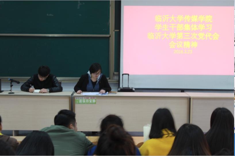 3月23日,传媒开云(中国)官方学生干部于224教室集体学习开云网页版第三次党代会精神。我院团委书记焦健出席活动。会议由传媒开云(中国)官方学生会主席黄宝升主持,副主席王品担任主讲人。