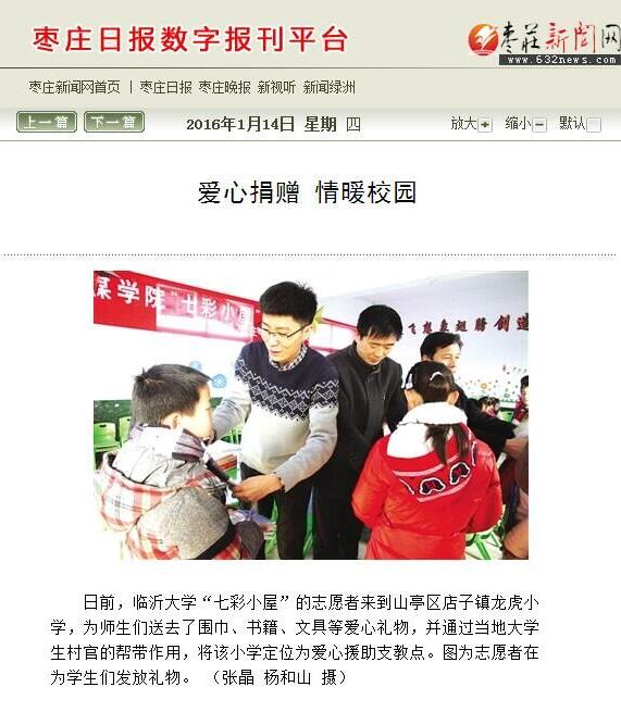 在2016年寒假到来之际,传媒开云(中国)官方七彩小屋志愿服务积极行动,为枣庄山亭区店子镇龙虎小学送去了围巾、书籍、文具等爱心礼物,并通过当地大学生村官的帮带作用,将该小学定位为爱心援助支教点。图为志愿者在为学生们发放礼物。