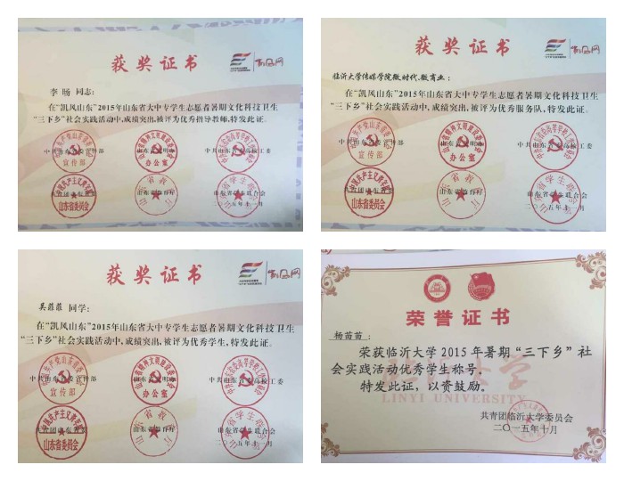 在2015年山东省大中专学生志愿者暑期文化科技卫生“三下乡”社会实践活动总结评选中,我院辅导员老师李旸获优秀指导教师荣誉称号;我院微时代、微商业团队获评优秀服务队;吴菲菲等4名同学获评优秀学生称号。