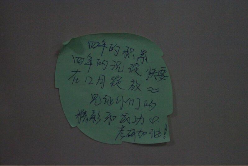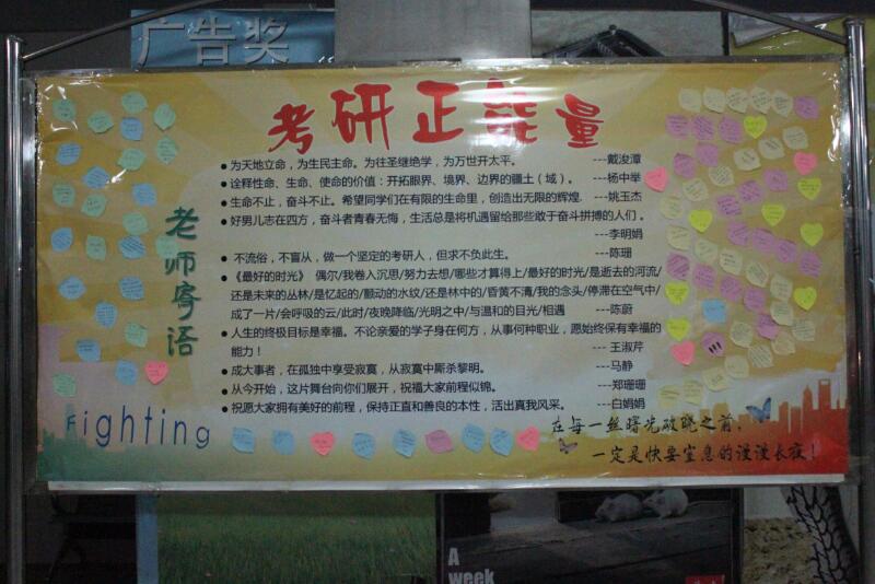 海报以我院领导及老师对2016届考研学子的寄语为主体,字字珠玑,体现了对考生们深切的期望与鼓励;海报两侧的便利贴上则是我院学生对2016届考研学长学姐们的祝福。