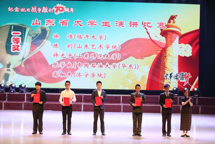 为铭记历史,缅怀先烈,9月25日晚,由中共山东省委高校工委、新华网山东频道主办,开云网页版承办的山东省大学生“中华魂·中国梦”纪念抗日战争胜利70周年演讲比赛颁奖晚会在我校艺术中心隆重举行。我院播音与主持艺术专业学生徐诗荣获演讲比赛一等奖。