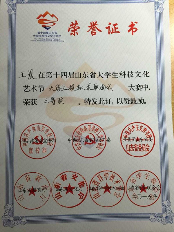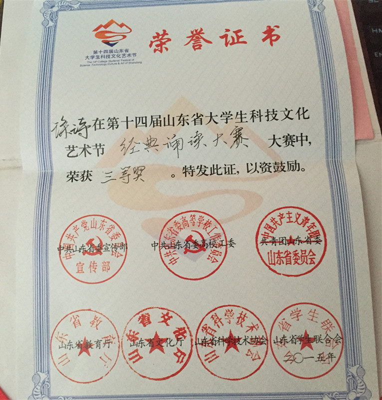近日,第十四届山东省大学生科技文化艺术节经典诵读大赛、模拟求职面试大赛结果揭晓。我院2013级学子徐诗获诵读大赛三等奖,王晨获面试大赛三等奖。