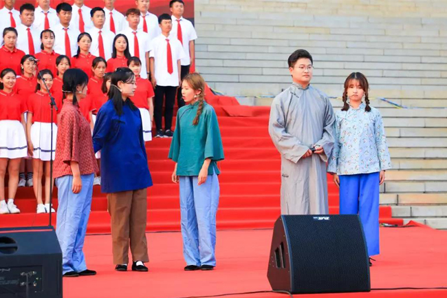 新中国成立的彩色影像在大屏幕播放。“新中国成立了!”五星红旗,在天安门广场升起。这一刻,我们心潮澎湃、热泪盈眶,一起高唱《红旗飘飘》。