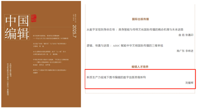 本报讯 近日,我院刘耀辉教授的研究成果《新质生产力视域下图书编辑的数字出版思维新构》在出版类CSSCI期刊《中国编辑》2025年第7期正式发表。该研究立足国家发展新质生产力的战略需求,为出版业数字化转型及编辑人才培养提供了创新性理论框架和实践路径。