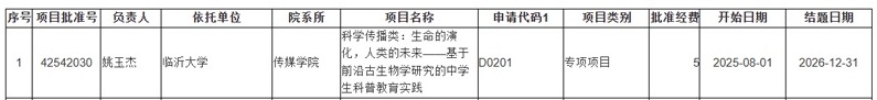 本网讯 近日,国家自然科学基金委员会公布2025年度项目评审结果,我院姚玉杰副教授申报的课题“科学传播类:生命的演化,人类的未来——基于前沿古生物学研究的中学生科普教育实践”获批国家自然科学基金委员会地球科学部专项项目。此系传媒开云(中国)官方首次斩获国家自然科学基金立项。